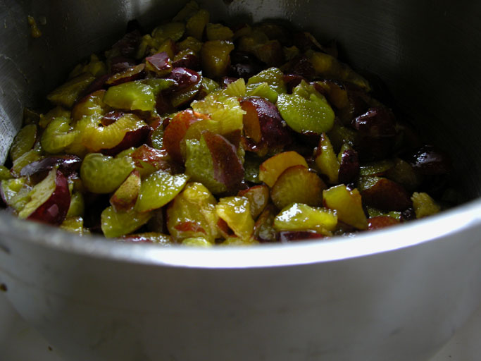 I put the little plate in the fridge to cool. After washing the plums I removed the stones and cut the plums into little pieces. I put them in the pot together with the juice of two lemons and cooked them slowly until they became quite liquid. Do not allow it to boil at this stage.